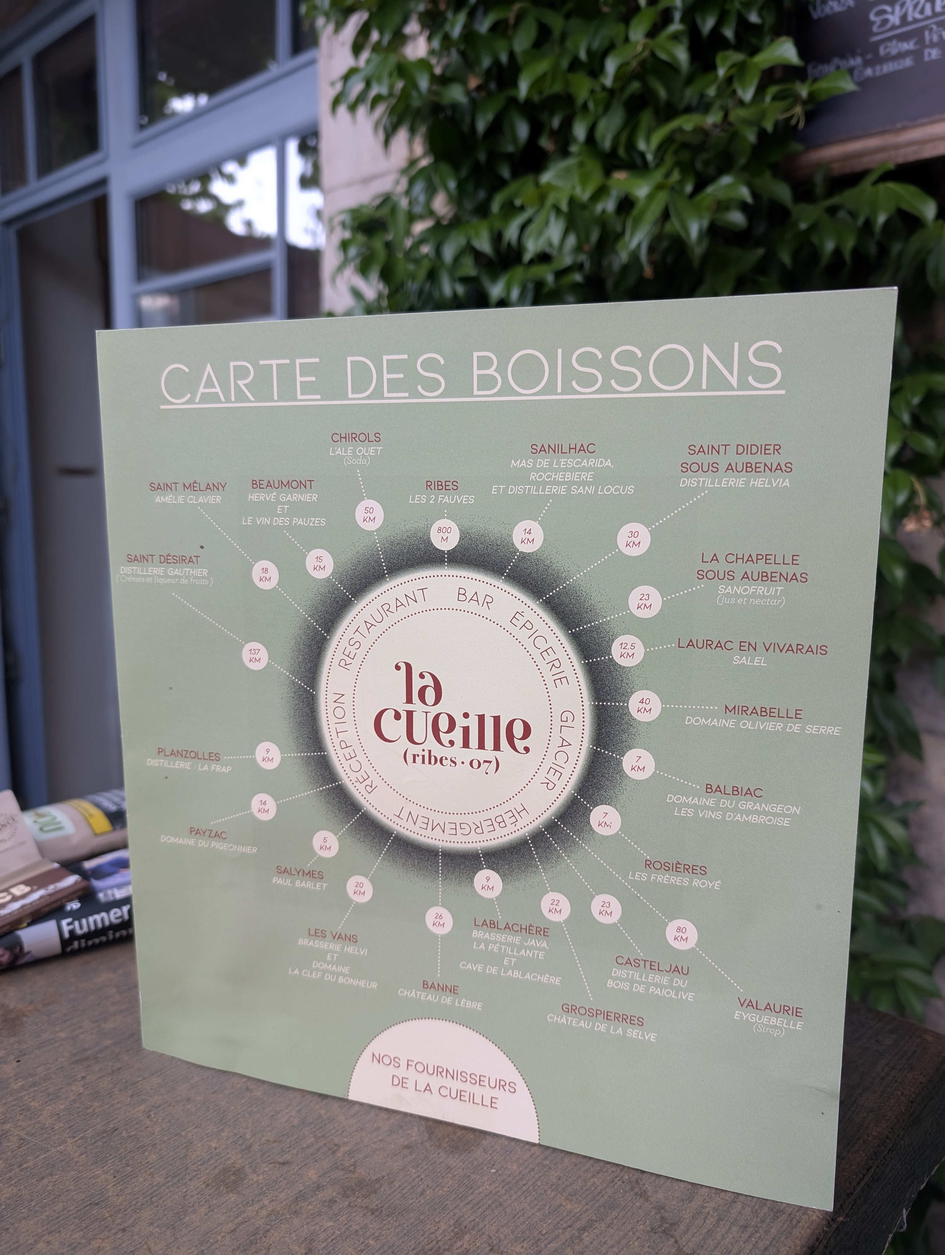 Aan de bar van La Cueille vertelt elk glas een lokaal verhaal. Bieren gebrouwen in Rocles en Lablachère, wijnen van vergeten druivensoorten van Ardèche-wijnmakers, cocktails bereid met ambachtelijke sterke dranken uit de buurt — en zelfs het bruiswater komt uit Ribes.